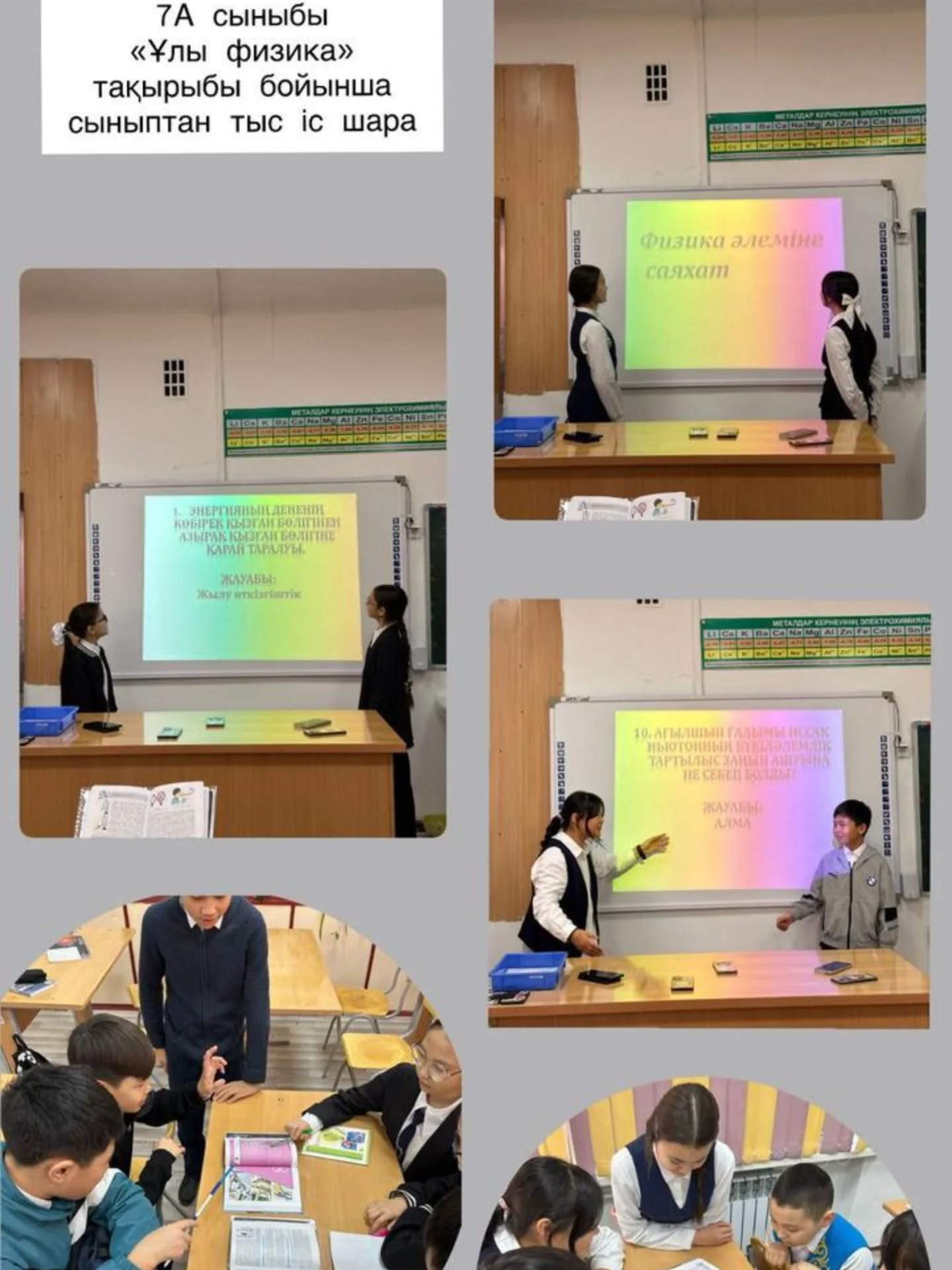 7А сыныбында «Ұлы физика» тақырыбында сыныптан тыс танымдық іс-шара ұйымдастырылды. Іс-шара барысында оқушылар «Физика әлеміне саяхат» жасап, қызықты сұрақтар мен тәжірибелер арқылы білімдерін сынады.