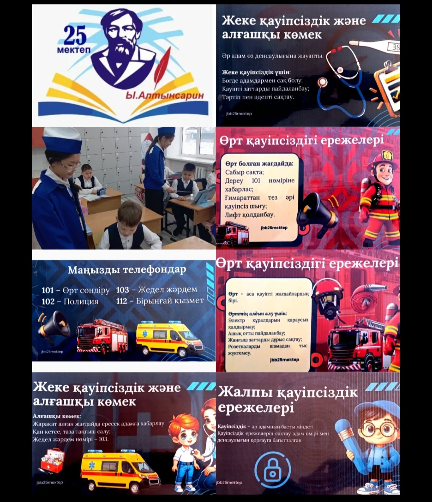 Оқушыларға қауіпсіздік ережелерін сақтау, төтенше жағдай кезінде дұрыс әрекет ету жолдары түсіндірілді. Жадынамада өрт, жер сілкінісі және басқа да қауіпті жағдайлар кезінде сақталатын негізгі қағидалар көрсетілген.