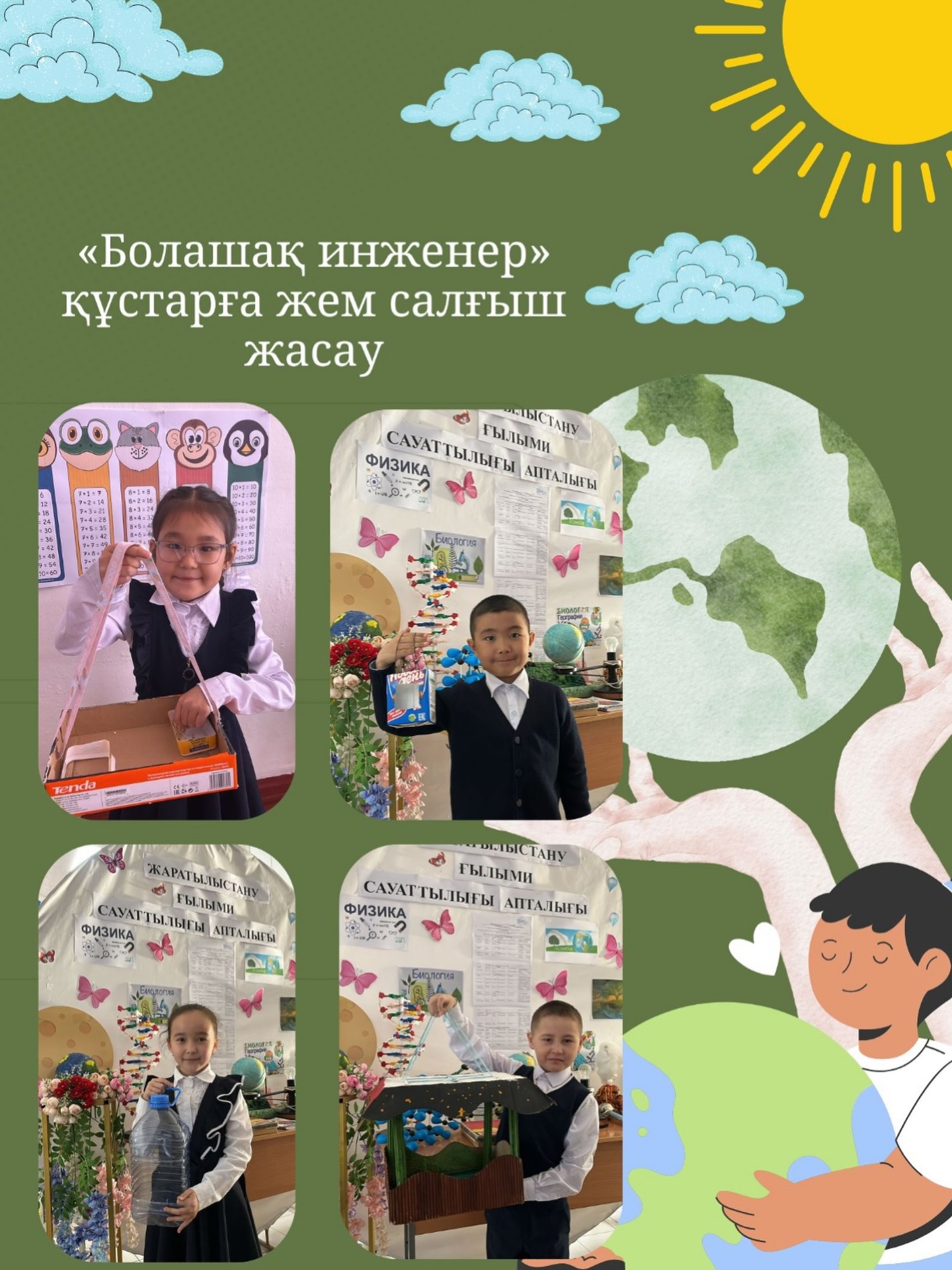 🔰«Ы.Алтынсарин атындағы №25 ЖББ мектебі» КММ-інде Қарағанды облысы білім беруді дамытудың оқу-әдістемелік орталығының ұйымдастыруымен «Ғылым және технология» жаратылыстану-ғылыми сауаттылығы апталығының мектепішілік жоспарына сәйкес 2 Ә сынып оқушылары құстарға жем салғыш жасады. Құстарға жем салғыш жасау – табиғатқа қамқорлық көрсетудің қарапайым әрі пайдалы жолы. Әсіресе қыс мезгілінде құстарға қорек табу қиын болғанда, жем салғыштар олардың тіршілігін сақтауға көмектеседі.
